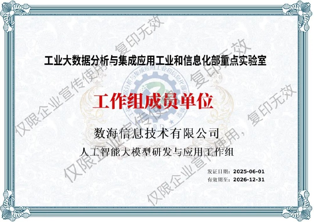 數(shù)海信息集團(tuán)入選工信部重點實驗室人工智能大模型研發(fā)與應(yīng)用工作組,助力工業(yè)大數(shù)據(jù)創(chuàng)新與應(yīng)用??